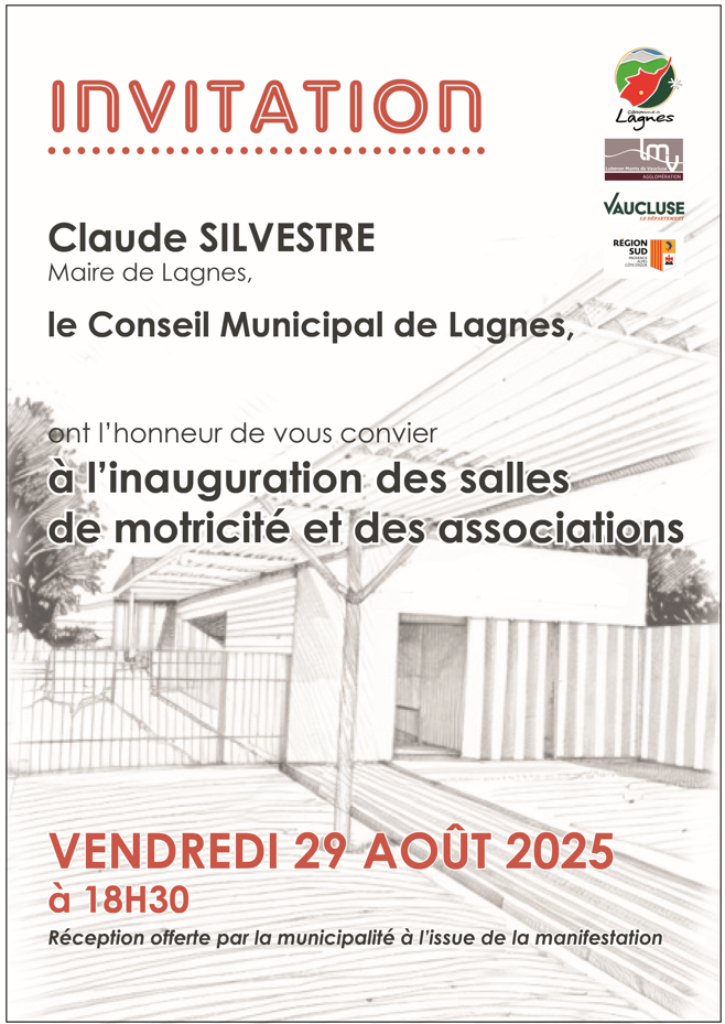 Claude SILVESTRE Maire de Lagnes et le Conseil Municipal de lagnes ont l’honneur de vous convier à l’inauguration des salles de motricité et des associations, vendredi 29 août 2025 à 18h30.