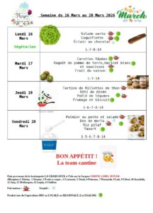 Menu de la cantine du 16 au 20 mars 2026.