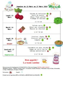 Menu de la cantine du 23 au 27 mars 2026.