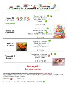 Menu de la cantine du 29 septembre au 3 octobre 2025 Date 29 Sep 2025 - 03 Oct 2025 Heure Toute la journée