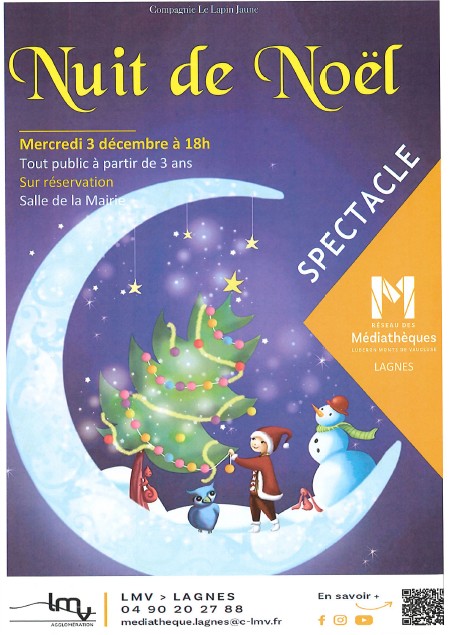 SPÉCTACLE : NUIT DE NOËL À partir de 3 ans, sur réservation. Date 03 Déc 2025 Heure 18 h 00 min Lieu Médiathèque Communautaire