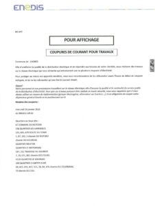 ENEDIS : coupures de courant pour travaux mercredi 28 janvier 2026.